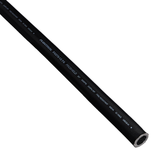 This compact wire Pro-Shield 1/4" hydraulic hose is designed with a synthetic rubber tube and reinforced with two braids of ultra high-tensile steel wire. Designed to safely transport petroleum-based hydraulic fluids, water, diesel fuel, lubricating oils, biodegradable hydraulic oils and fire resistant synthetic Polyol Esters.