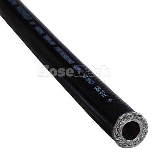 This compact wire Pro-Shield 1/4" hydraulic hose is designed with a synthetic rubber tube and reinforced with two braids of ultra high-tensile steel wire. Designed to safely transport petroleum-based hydraulic fluids, water, diesel fuel, lubricating oils, biodegradable hydraulic oils and fire resistant synthetic Polyol Esters.