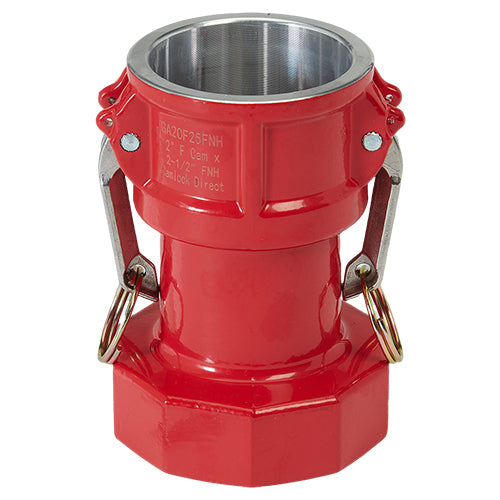 Our aluminum cam and groove to NH fire hose threaded fittings are designed to convert a standard NH/NST "fire hose thread" hose or adapter to a standard camlock. Finished in bright orange to distinguish them from regular camlock to NPT "pipe thread" cam and grove fittings. NH/NST threads are
