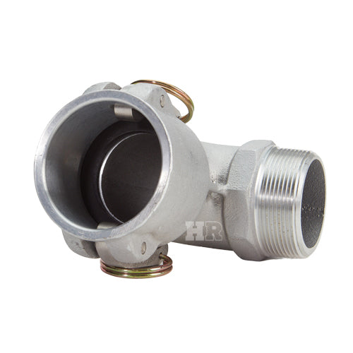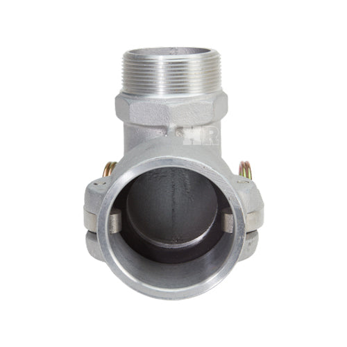 Type "B" aluminum 2 inch female camlock (Cam & Groove) coupler to 2 inch male NPT threads 90° elbow.