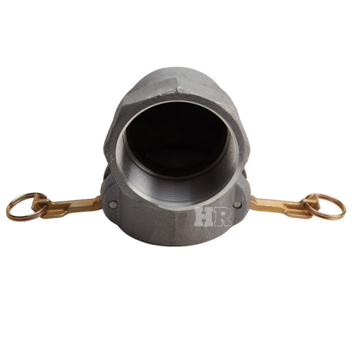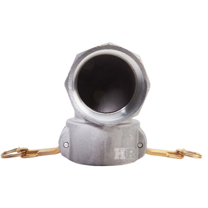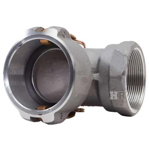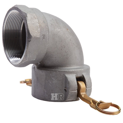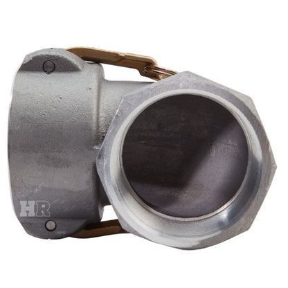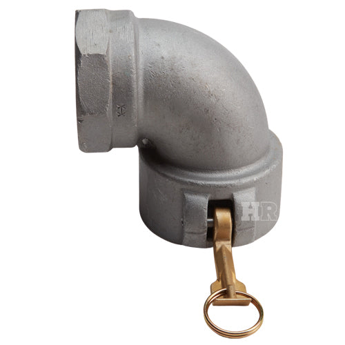 Type "D" aluminum 3 inch female camlock (Cam & Groove) coupler to 3 inch female NPT threads 90° elbow.