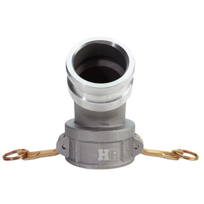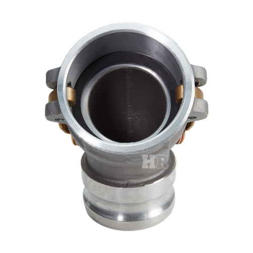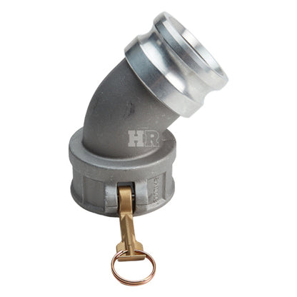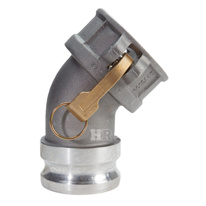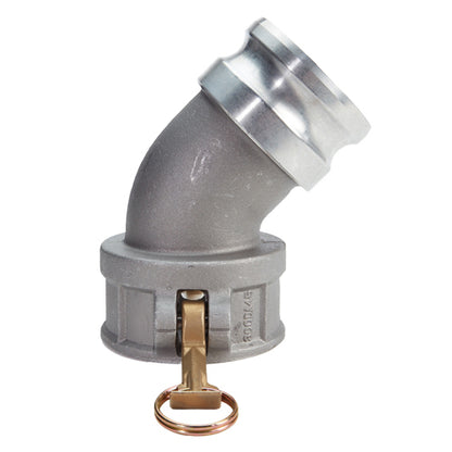 Aluminum 3 inch female camlock (Cam & Groove) coupler to 3 inch male camlock (Cam & Groove) coupler 45° elbow.