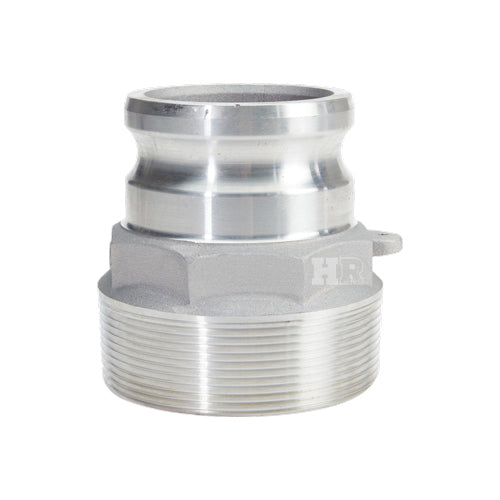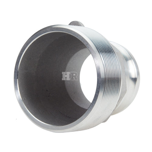Global type "F" aluminum 3 inch male camlock (Cam & Groove) coupler to 4 inch male NPT threads.