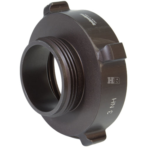 Aluminum adapters are fabricated from seamless extruded 6061-T6 aluminum and hard coat anodized per MIL-A-8625 Type III, Class 1. Threads have a blunt start Higbee cut with indicators on adjacent lugs. Part identifications are permanent and stamped prior to hardcoat. Adapters and components meet the requirements of NFPA 1963.