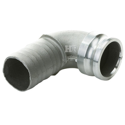 Type "E" aluminum 4 inch male camlock (Cam & Groove) coupler to 4 inch hose shank 90° elbow.