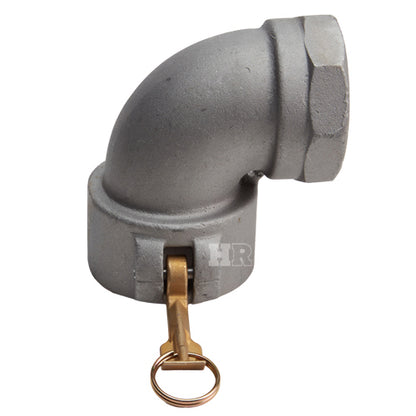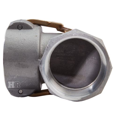 Type "D" aluminum 6 inch female camlock (Cam & Groove) coupler to 6 inch female NPT threads 90° elbow.
