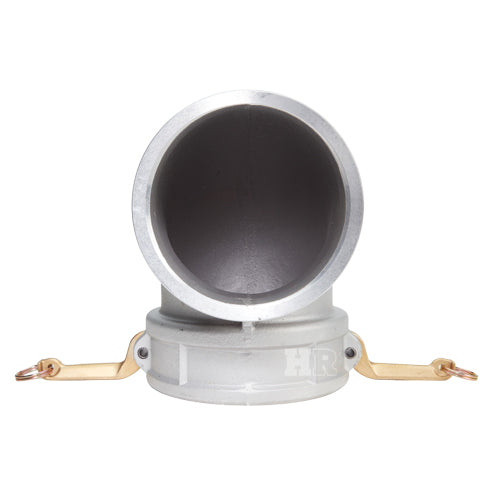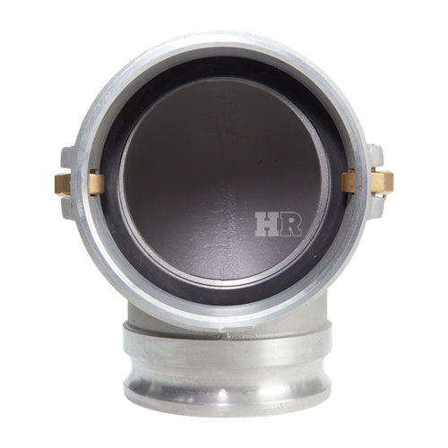 Aluminum 6 inch female camlock (Cam & Groove) coupler to 6 inch male camlock (Cam & Groove) coupler 90° elbow. Under no circumstances should cam and groove couplings be used for compressed air or steam service!