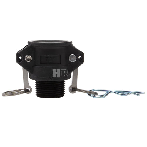 Type "B" polypropylene 1 inch female camlock (Cam & Groove) coupler to 1 inch male NPT threads.