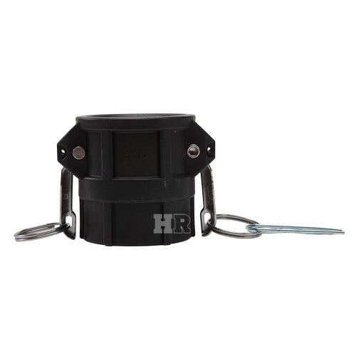 Type "D" polypropylene 2 inch female camlock (Cam & Groove) coupler to 2 inch female NPT threads.
