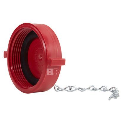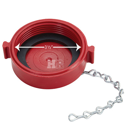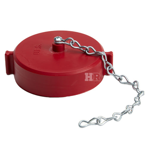 Thermoplastic 3.0 inch NH / NST threaded cap with chain. This cap features a 9 inch long chain for a secure connection to the wall or equipment. Constructed from hardened thermoplastic. Chain and gasket included.