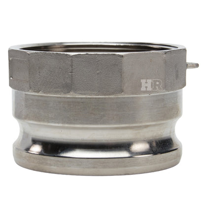 Type "A" stainless steel 4 inch male camlock (Cam & Groove) coupler to 4 inch female NPT threads.