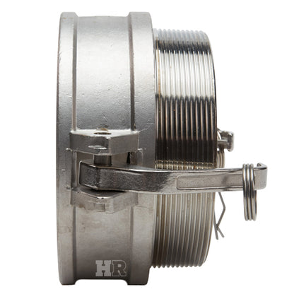 Global type "B" stainless steel 6 inch female camlock (Cam & Groove) coupler to 6 inch male NPT threads.